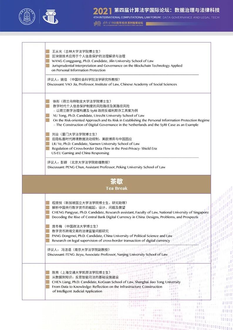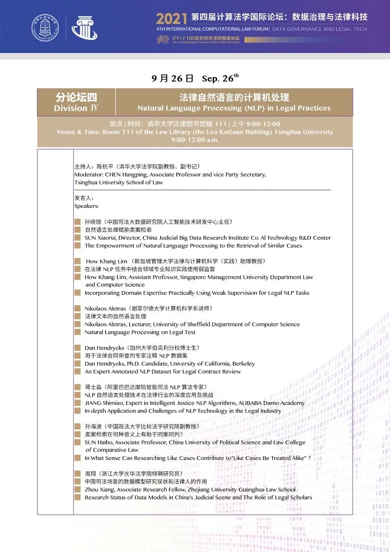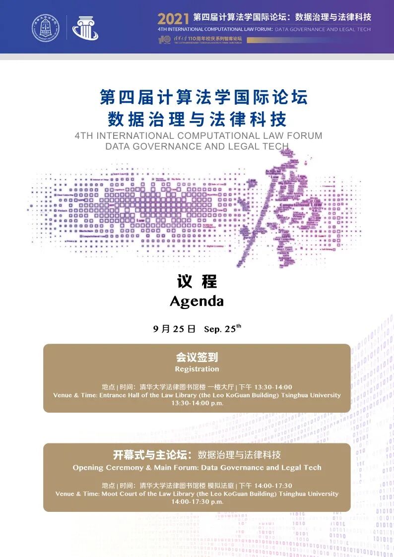 清华大学法学院与清华大学智能法治研究院将于2021年9月25日-26日在法律图书馆楼(廖凯原楼)举办清华大学第四届计算法学国际论坛暨110周年校庆系列智库论坛:数据治理与法律科技。本次论坛邀请到来自海内外高校、科研院所、司法机关、产业界等各领域的资深专家学者及青年学生,共同研讨有关数据治理与法律科技的前沿学术及实践问题。欢迎大家参会!