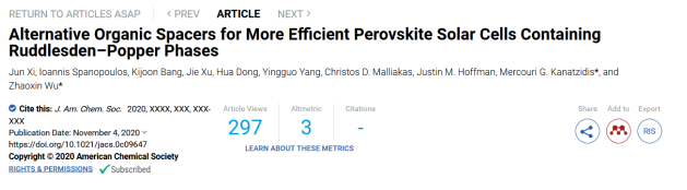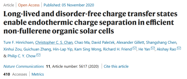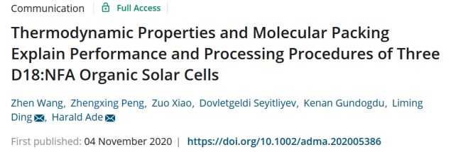 https://doi.org/10.1002/adma.20200497115. Adv. Mater.:石墨烯上铜纳米线自发分裂为量子点抑制锂枝晶石墨烯作为一种新兴的碳同素异形体,其可控生长已成为探索其独特科学性质和应用的重要手段。本文系统地研究了铜(Cu)晶体结构对石墨烯生长的影响。发现晶界是反应活性的来源。在生长的石墨烯作用下,多晶铜纳米线自发地分裂成约3nm的铜量子点。这些铜量子点均匀地分散在石墨烯上,它们阻止了石墨烯的长程有序生长。这些原位支撑在石墨烯上的铜量子点具有很高的抑制锂金属电池中锂枝晶生长的作用。基于这一有趣的发现,可以大规模地制备锚定在全碳石墨烯上的铜量子点,并实现铜量子点在电化学领域的独特应用。https://doi.org/10.1002/adma.20200437916. J. Am. Chem. Soc.: 替代有机间隔物,可提高含Ruddlesden-popper相的钙钛矿太阳能电池的效率化物钙钛矿ruddlesen-popper (RP)相是一种类似的可溶解处理半导体的层状亚类,已引起人们的广泛关注,特别是在发展长期太阳能光电方面。它们被定义为(A’)2(A)n−1PbnX3n+1 (A’=间隔阳离子,A =笼阳离子,X =卤化物阴离子)。低温自组装薄膜的定向控制是控制垂直于衬底的载流子输运能力的一个基本问题。在这里,研究者们报道了一种新的化学衍生物,从分子的角度设计使用新型间隔阳离子3-苯基-2-丙烯铵(PPA)与共轭主链作为低温策略组装更高效的太阳能电池。首先,我们使用x射线衍射解决和精制单晶的晶体结构通式(PPA) 2 (FA0.5MA0.5) n−1 pbni3n + 1 (n = 2和3,空间群C2),然后使用混合卤(PPA) 2 (Cs0.05 (FA0.88MA0.12) 0.95) n−1 pbn (I0.88Br0.12) 3 n + 1类似物来实现更高效的器件。在形成RP相的同时,PPA与无机八面体之间的多个氢键加强了层状结构。我们观察到薄膜目标层厚度指数增加从n = 2到n = 4,那么水平无机层的择优取向逐步意识到随着增加存在高-n或3 d相,用一种改进的自由电荷载体基质电导率和垂直。因此,采用PPA-RP钙钛矿的平面p-i-n太阳能电池的效率为14.76%,在85℃和85%湿度条件下,经过600小时的封装后,效率为93.8±0.25% (ISOS-D-3)。https://doi.org/10.1021/jacs.0c0964717. Adv. Mater.:分离和结晶动力学对非富勒烯有机太阳能电池稳定性的作用如今,功率转换效率已超过17%,因此长使用寿命对于有机太阳能电池的成功应用至关重要。然而,大多数非富勒烯受体可以结晶并破坏装置,但是受体结晶的基本热力学和动力学方面受到的关注有限。在这里,研究者们测得的了两个最先进的非富勒烯受体ITIC-2Cl和ITIC-2F在室温(RT)扩散系数分别为3.4×10−23和2.0×10−22。 低系数足以提供形态的动力学稳定性,以防止在室温下发生混合。 另外,在ITIC-2F和ITIC-2Cl之间发现了结晶特性的深层差异。 二次离子质谱,差示扫描量热法(DSC),掠入射宽角X射线散射和显微镜观察到的差异可能直接与设备降解有关,并且归因于成核和生长速率的显着不同,在RT处的增长率相差12倍。ITIC-4F和ITIC-4Cl具有相似的特性。结果揭示了扩散系数和熔化焓在控制生长速率中的重要性,并且卤化的差异可以极大地改变结晶动力学和器件稳定性。此外,还描述了如何从DSC和显微镜实验中推断出低成核密度和大生长速率,这些实验可用于指导分子设计的稳定性。https://doi.org/10.1002/adma.20200534818. Adv. Mater.:协同优化使大面积柔性有机太阳能电池能够维持小面积刚性设备98%以上的PCE缝模涂布通常被认为是制造有机太阳能电池(OSC)的最有效的大规模方法。但是,相应的设备性能大大落后于旋涂设备。在本文中,研究者们协同地优化了有源层的形态,柔性基板的特性以及处理温度,从而为柔性单电池和模块两者都获得了高功率转换效率(PCE)。结果,1 cm 2的 柔性设备产生了12.16%的出色PCE,而旋涂小面积(0.04 cm2 )刚性设备PCE则为12.37%。同样,对于面积为25 cm2 面积的,观察到PCE为10.09%。因此,通过协同优化显着减少了与升级相关的效率损失。此外,在以10 mm的弯曲半径弯曲1000次之后,这些柔性设备仍会产生其原始PCE的99%以上,而在手套箱中存放6000 h以上后,该PCE会达到其初始值的103%,表明出色的设备灵活性以及出色的货架稳定性。因此,这些结果有希望地证实,在不久的将来,大型区域OSC的升级潜力巨大。https://doi.org/10.1002/adma.20200515319. Adv. Mater.:热力学性质和分子填料解释了三种D18:NFA有机太阳能电池的性能和加工程序最近,基于D18:Y6的有机太阳能电池(OSC)的功率转换效率达到了创纪录的18%以上。研究者们扩展了最初的工作,并将基于D18的OSC与三种非富勒烯受体Y6,IT-4F和IEICO-4Cl的器件性能进行了比较,并研究了它们的分子堆积特性和可混溶性。D18聚合物在所有薄膜中均显示出异常强的扩链性和出色的主链有序性,这可能有助于其出色的空穴传输性能。热力学特性表明D18:Y6和D18:IT-4F在室温下的混溶性接近于渗透阈值 这对应于理想的淬火深度,并解释了溶剂蒸汽退火而不是热退火的使用。相比之下,D18:IEICO-4Cl是一种低混溶性系统,在铸造过程中淬火深度较深,形态控制较差,性能较低。PC 的三元共混物失效 71 BM 很可能是由于Y6最初的理想混溶性所致,这表明D18开发成功的三元或四元太阳能电池的策略可能与其他高性能供体不同。这项工作揭示了基于D18的光伏器件的几种独特的性能-性能关系,并有助于指导设计或制造效率更高的OSC。https://doi.org/10.1002/adma.202005386 20. Nat. Commun.:长寿命和无混乱的电荷转移状态使吸热电荷分离高效非富勒烯有机