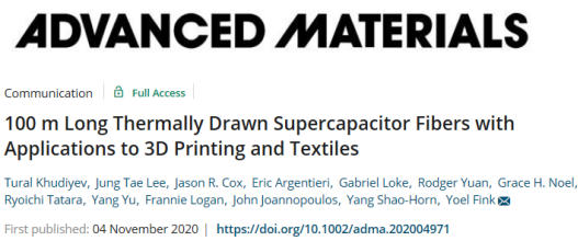 安全性和成本是大规模储能的关键指标。由于当前锂离子电池技术中使用了非水电解质和过渡金属氧化物,因此安全性、成本和环境问题是一个值得关注的重要问题。石墨具有工作电位高、成本低、安全性高等优点,是一种很有前途的双离子电池负极材料。然而,由于电化学稳定窗口很窄(1.23V),寻找合适的水电解质是一个挑战。本文介绍了一种石墨-锌-金属水溶液双离子电池,其电压约为2.3–2.5 V,在水性锌电池中具有非常高的电压,在200次循环后容量保持率大于80%,并且在200 mA g–1的充放电电流下可提供≈110 mAh g–1。当充放电电流为5000 mA g–1,可获得接近60 mAh g–1的电流。使用高浓度无锂双盐水电解质,使天然石墨成为可逆阴极。https://doi.org/10.1002/aenm.20207016913. Adv. Funct. Mater.:低成本碳基钙钛矿太阳能电池的全电喷雾技术随着钙钛矿型太阳能电池(PSCs)的功率转换效率超过25%,PSCs向初步工业化迈进了一步。在从实验室制造转移到工业制造之前,诸如可扩展性、材料成本和生产线兼容性等对制造业有重大影响的问题仍有待解决。在这里,报告了所有这些方面的突破。碳基PSC具有氟掺杂氧化锡(FTO)/电子传输层/钙钛矿/碳结构,无需空穴传输层和贵金属电极,实现超低成本配置。这种PSC体系结构采用可扩展和工业兼容的电喷雾(ES)制造技术,可实现所有电池层的连续打印。ES沉积的电子传输层和钙钛矿层的性能与实验室规模的旋涂法相当。与传统的刮片法相比,电沉积碳电极层具有优越的导电性和界面微观结构。以14%的无碳转化率为基准,完全可以与PS41的功率转换率相媲美。这些结果将对PSC的可扩展生产产生影响。https://doi.org/10.1002/adfm.20200680314. Adv. Mater.:100米长热拉伸超级电容器纤维,用于3D打印和纺织品超级电容纤维具有充电时间短、循环寿命长、功率密度高等优点,有望为柔性织物电子产品提供动力。然而,迄今为止,只生产了短长度的功能纤维超级电容器。本研究的主要目的是介绍一种超级电容器光纤,以解决扩展性、灵活性、包层抗渗性和性能方面的剩余挑战。这是通过一种自上而下的制造方法来实现的,在这种方法中,一个大尺寸的预制件被热拉入一个功能齐全的储能光纤中。预成型体由五部分组成:热可逆多孔电极和电解质凝胶;导电聚合物和铜微丝集电器;以及一个密封的包层。这一过程产生了100米连续功能超级电容器纤维,比以往任何报告都长一个数量级。除了柔韧性(5 mm曲率半径)、抗湿性(100次洗涤循环)和强度(68 MPa),这些纤维在3.0 V下的能量密度为306 μWh cm−2,在1.6 V下的电容保持率约为13 000次循环的100%。为了证明这种纤维的实用性,它是机器编织的,并用作3D打印的长丝。