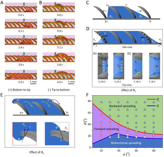 研究者为了进一步揭示南洋杉叶片及ALIS上的流体自主择向机理,观测了接触角为32° 和60°的两种流体在ALIS上的固/液接触线变化规律(图3A-C)。首先,当流体填充满第一个结构空腔时,其运动行为被四个临界接触位点限制。对于接触角为32°的流体,其首先突破左下方的临界接触位点限制,并选择一种自下而上的铺展形式。随着流体的上升,一个新的铺展循环出现,实现了连续和长程的正向流体输运。对于接触角为60°的流体,其因左下方和右下方的铺展均被限制而产生一种自上而下的铺展形式,进而实现连续和长程的负向流体输运。研究者通过力学分析,揭示了流体如何自主选择铺展方向的本质,如图3C-E所示。对于图3A所示的自下而上的铺展情景,流体沿着特定方向的自发铺展需要两个条件。第一,流体能接触到相邻的锯齿结构;第二,流体前端受到的驱动力足够克服结构的扎钉效应。在ALIS上, 3D毛细锯齿结构的底面和侧面的固/液接触线处分别产生了促进流体铺展的动力和阻碍流体铺展的阻力。通过平衡左下方和右下方动力和阻力的关系,获得对应接触位点处流体突破结构扎钉效应的临界接触角。由于横向曲率结构的存在,左下方和右下方接触位点处的临界接触角存在显著差异,这为流体自主选择铺展方向奠定了基础。▲图3 仿南洋杉叶片结构功能表面上流体的自主择向机理分析。