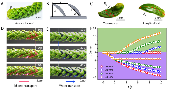 近日香港城市大学王钻开教授及其合作者在仿生功能表面流体操控领域取得突破性进展。该研究成果以“3D capillary ratchet-induced liquid directional steering”为题发表在国际顶级期刊《Science》上,首次报道了一种亚毫米级3D毛细锯齿结构诱导的流体自主择向。该结构通过建立非对称3D固/液界面交互作用,调控不同表面张力流体的铺展模式和输运方向,实现自主择向、快速、长程的流体输运,为流体操控的广泛应用开辟了新的途径。该论文被Science News highlight,同时也被十多家国内外媒体所报道。固/液界面相互作用广泛存在于各种实际工程领域,如微流控、微反应器、水收集及冷凝换热等。自1804年Thomas Young首次提出表/界面科学润湿性基础理论以来,研究者就亲水表面流体快速铺展和疏水表面的流体弹跳开展了大量的研究,普遍认为流体趋向于向能量降低的方向运动,其运动方向主要由表面结构决定而与其本征性质无关。例如,流体倾向于在润湿性梯度产生的非对称驱动力作用下从高表面能区域向低表面能区域运动、在拉普拉斯压力的作用下从高曲率区域向低曲率区域运动、在各向异性结构上流体铺展动态差异的作用下从高流体扎钉区域向低流体扎钉区域运动。然而,在同一材料表面上,流体能否改变自己的命运来自主决定其运动方向的科学难题尚未被解答。研究者首次发现自然界中南洋杉叶片表面流体自主择向:低表面能流体沿着叶片倾斜的方向运动,而高表面能流体沿着反方向运动。进一步研究发现,南洋杉叶片由具有横向和纵向曲率的双重悬臂结构的锯齿周期性排列组成,区别于传统微米结构表面仅能诱发2D固/液界面作用,南洋杉叶片结构表面及仿南洋杉结构功能表面(ALIS)能够诱发非对称3D固/液界面交互作用,调控不同表面张力流体的铺展模式,实现同一表面上流体的自主择向。同时,ALIS能够显著促进或抑制毛细升现象,且在没有任何纳米结构的前提下实现快速和长程的毛细升效应。该研究成果获得了审稿人的高度肯定。审稿人一评价道:“This work is high quality and the only question is whether it is sufficiently ground breaking and of wide interest for Science. My view is that the answer is yes. This study is certainly likely to open up many new avenues for research and inspire many others to adapt and extend the key ideas for both more fundamental research and for applications. (这是一项高质量的工作,唯一的疑问是它是否具有充分的开创性和广泛的兴趣,使其发表在《科学》上,我的看法是肯定的。这项研究必将开辟许多全新的研究方向,并启发科研人员在基础和应用研究领域探索出更多延伸性工作。)”。审稿人二评价道:“The results are quite unique, and unlike any other papers forming the huge body of results published in the field of textured and directional wettability.(该研究结果非常独特,区别于定向润湿领域以往发表的其他论文成果)”。南洋杉叶片由具有横向和纵向曲率的双重悬臂结构锯齿周期性排列组成(图1A-C)。该表面可以实现乙醇沿着锯齿结构倾斜的方向运动,而水沿着反方向铺展的液体自主择向现象(图1D-E)。其中,沿着叶片倾斜的方向被定义为正方向,反之定义为负方向。研究者通过混合不同比例的乙醇和水,制备不同表面张力的流体,探究表面张力和流体运动方向的关系。研究表明,当乙醇浓度c < 10 %时,流体沿正方向运动,当10% < c < 40%,,流体双向运动,当乙醇浓度c > 10 %时,流体沿负方向运动,如图1F所示。研究者受南洋杉叶片结构启发,通过高精度3D打印技术,设计并制备了仿南洋杉叶片结构功能表面(ALIS)。该表面由平行排列的具有横向和纵向曲率的双重悬臂结构的锯齿阵列组成,其结构尺度在亚毫米数量级(图2A-C),可以定义为3D毛细锯齿结构表面,其特征长度和流体毛细长度相当。该仿生功能表面展现出和南洋杉叶片相似的流体择向性能:c = 40 %的流体沿正方向运动,而c = 10 %的流体沿负方向运动,如图2D-F所示。进一步研究表明,不同表面张力的流体在ALIS上的接触角从~20°增加到~82°,其传输方向从正方向逐渐过渡到负方向,临界转变接触角为42 ± 5°,如图2G所示。并且,即使在逆重力的情况下,ALIS表面依然展现流体择向性能,如图2H所示。▲图2 仿南洋杉叶片结构功能表面上流体的自主择向。