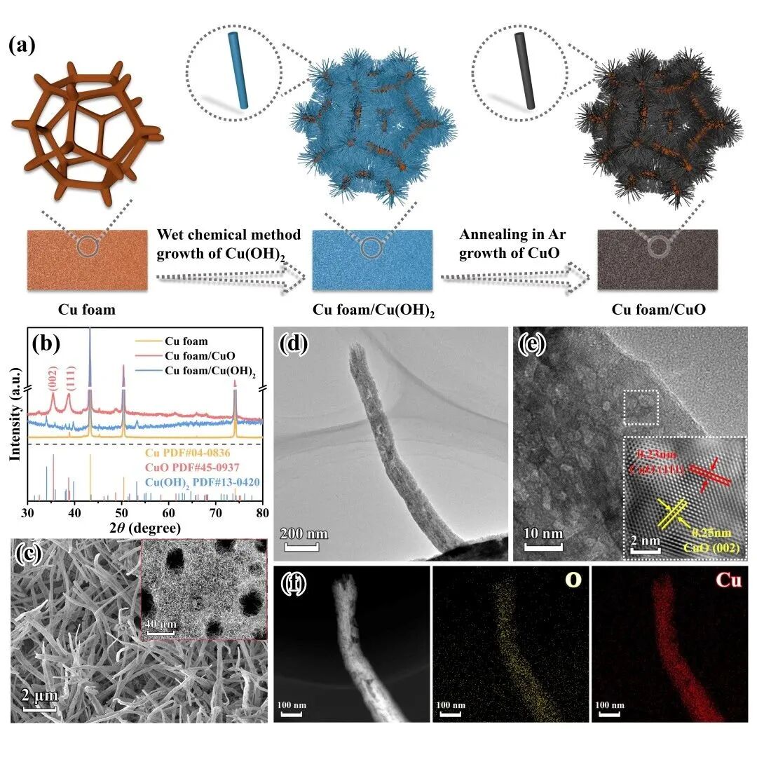 在本工作中,研究者首先通过湿化学法在泡沫铜上原位生长Cu(OH)2纳米线阵列,再退火将Cu(OH)2纳米线阵列转化为CuO纳米线阵列,通过X射线衍射谱、扫描电镜和透射电镜等表征方法,证明了CuO纳米线阵列均匀生长于泡沫铜上。