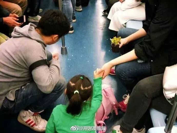 地铁上,孩子把爆米花洒在了地铁车厢里,父母赶紧蹲下,跟孩子一起一粒一粒捡起。