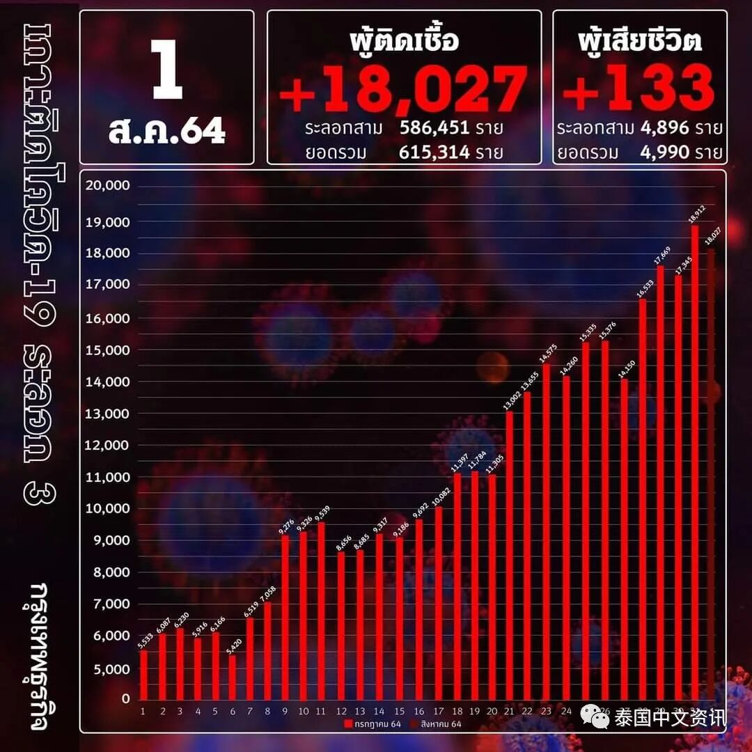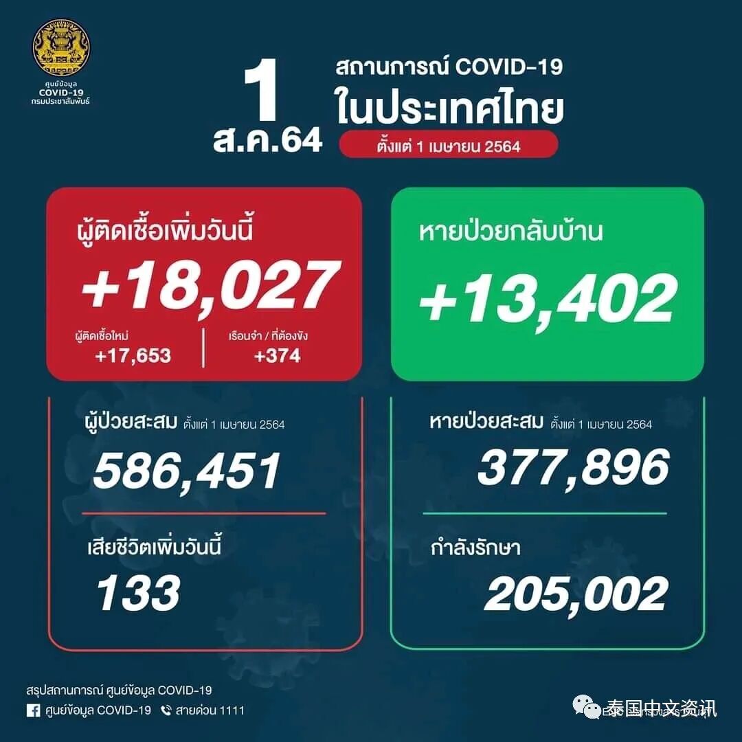 泰国网报道,8月1日,据泰国疫情信息中心官方消息,泰国新增确诊18027例,其中包括监狱新增374例,4月1日至今已累计确诊586,451例;新增死亡133例,新增治愈13402例,4月1日至今已累计治愈377,896例,尚有205,002名患者在院治疗。