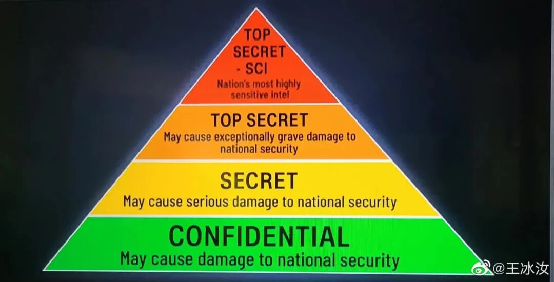 知识点:Top Secret/ SCI 是指涉及美国最敏感情报的最高绝密文件;Top Secret是绝密文件,可能对国家安全造成特别重大的损害;Secret是机密文件,可能对国家安全产生严重损害;Confidential是级别最低的秘密文件。