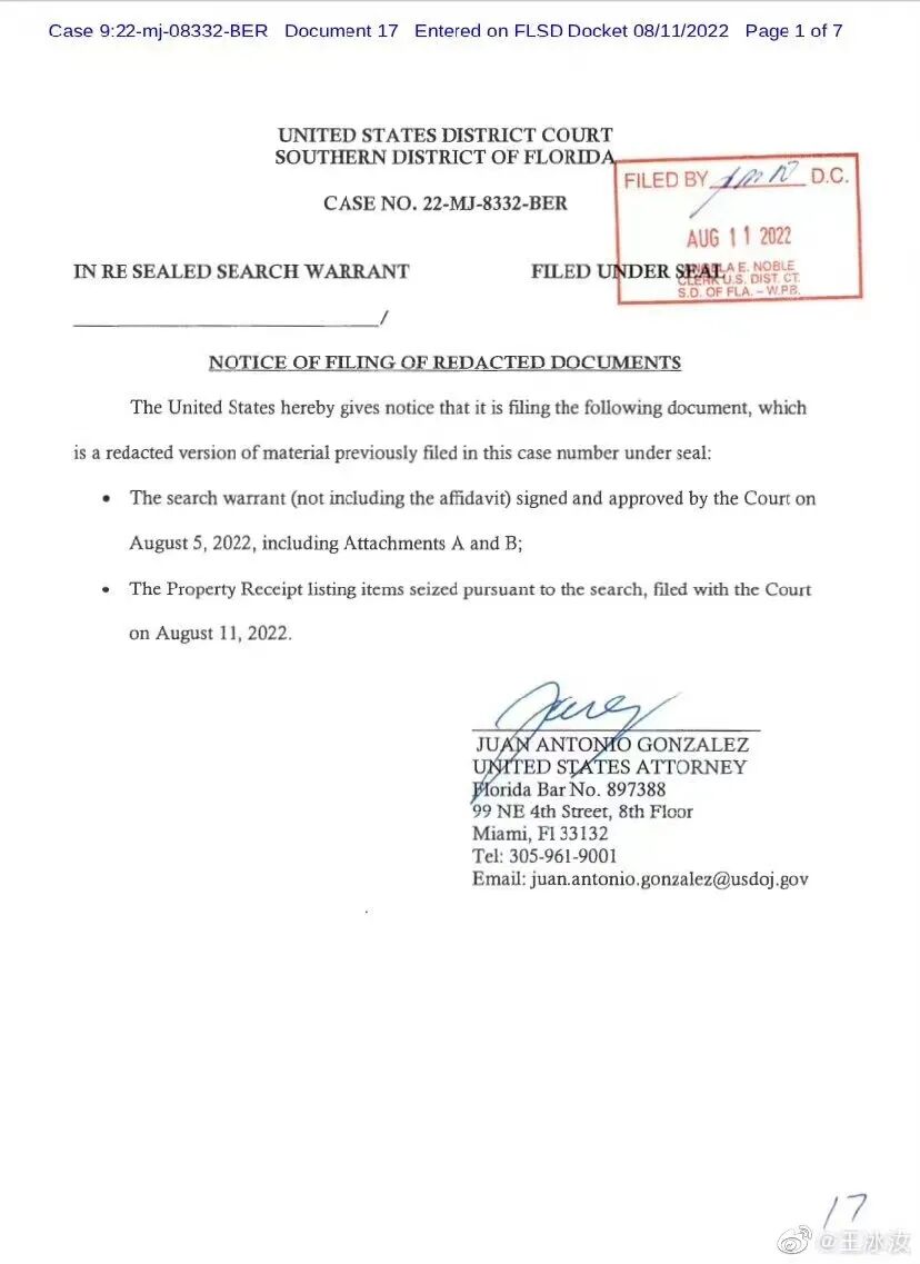 FBI上周一突袭海湖庄园,随后在周五公开了搜查令和获取的财产清单:当局查收了大约20箱物品,11套秘密文件,其中四套文件被标注为“最高绝密”(Top Secret),三套机密文件(Secret), 三套秘密文件(Confidential)。