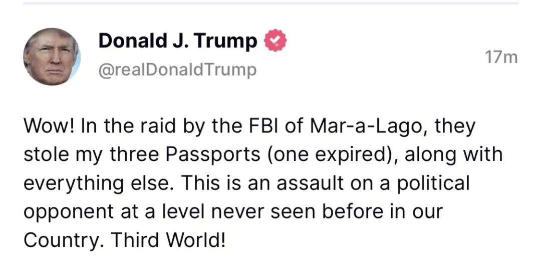 特朗普15号证实,FBI从海湖庄园“偷”了他三本护照,其中一本是过期的。而华盛顿邮报的爆料还包括与核武器相关的文件,以及与法国总统相关的文件。