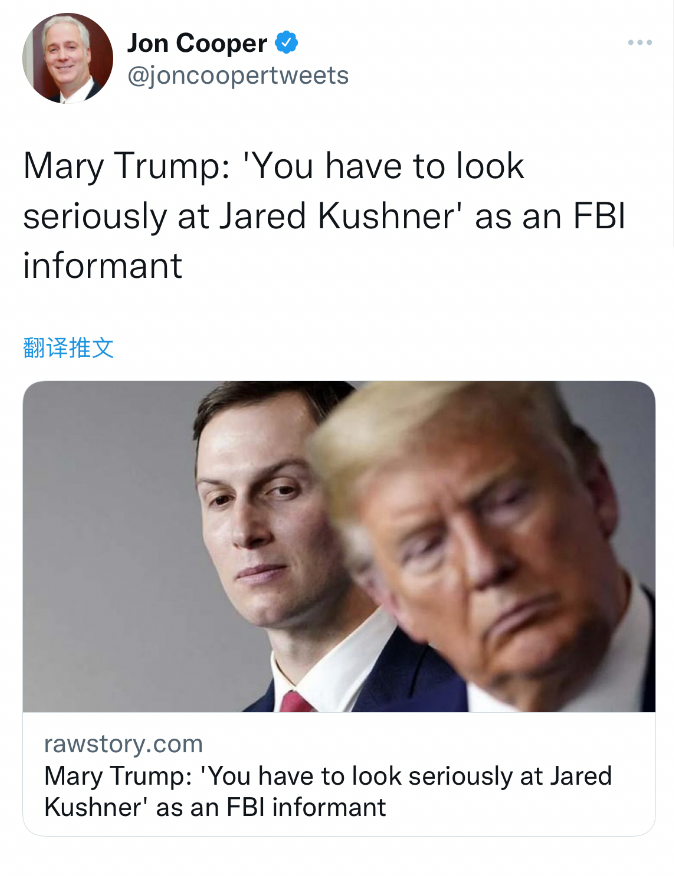 捉内鬼仍在进行中,而一直与特朗普不和的侄女玛丽·特朗普接受了电视采访,直接将矛头指向了库什纳,她表示众所周知的是,从2020年新冠疫情在美国爆发之后,库什纳就开始同特朗普貌合神离,而当大选结果还未正式公布时,库什纳直接接受了大势已去,并且携伊万卡从华盛顿搬到了迈阿密。