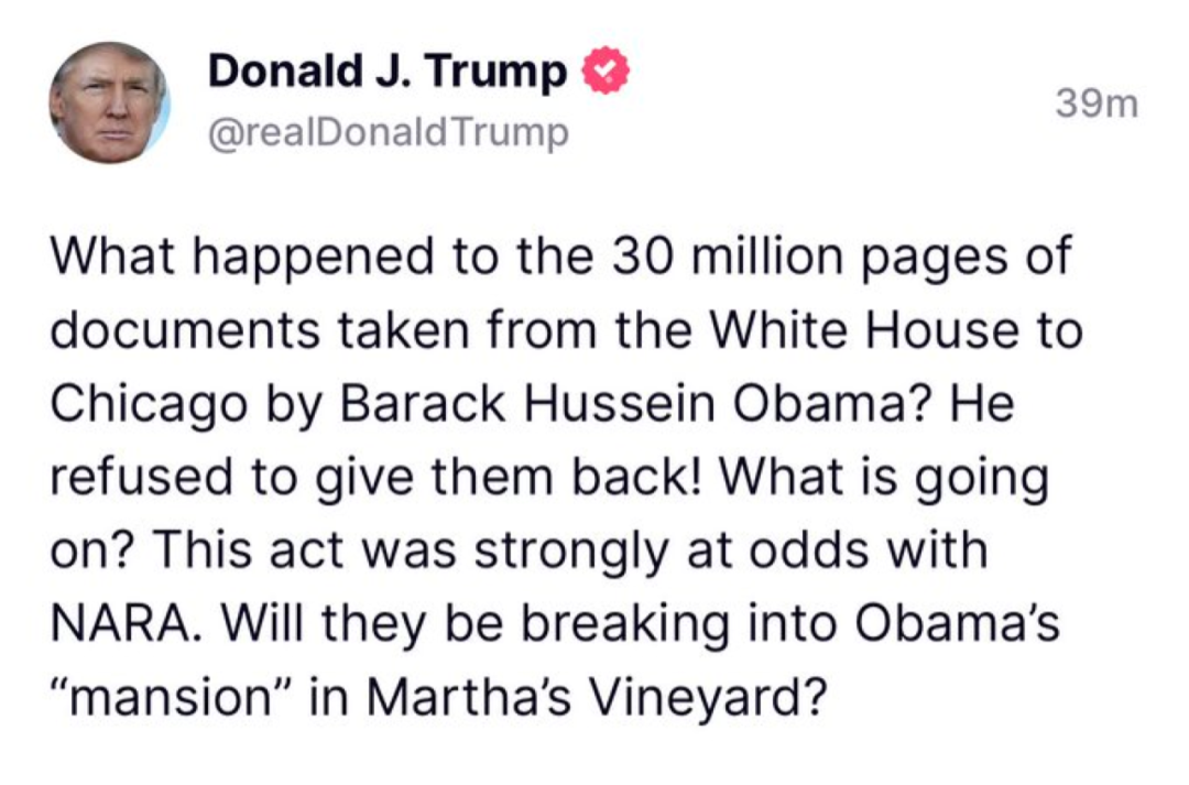 这次的文件搜查,特朗普也不忘拖奥巴马下水。他在社交媒体上上说,奥巴马保留了3300万页的文件:“其中大部分都是机密文件,多少和核武器有关呢?答案是很多!”