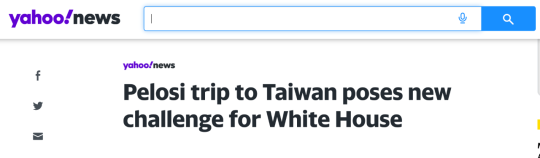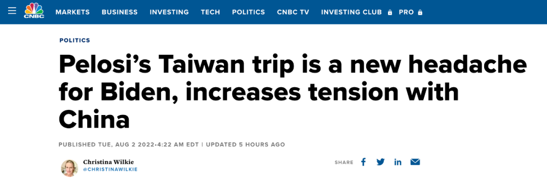 CNBC的标题是《佩洛西台湾之行令拜登头疼不已,加剧中美紧张关系》。虽然拜登政府小心翼翼地避免直接回答是否支持佩洛西的访问,但是白宫和五角大楼毫不掩饰他们的反对。上周,拜登就说了实话:“美国军方认为,这不是一个好主意。”