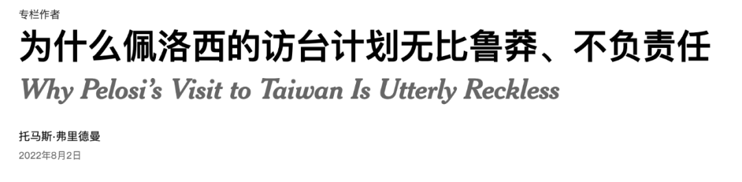 纽约时报专栏作家弗里德曼今天专门写了一篇文章,叫做《为什么佩洛西的访台计划无比鲁莽、不负责任》。