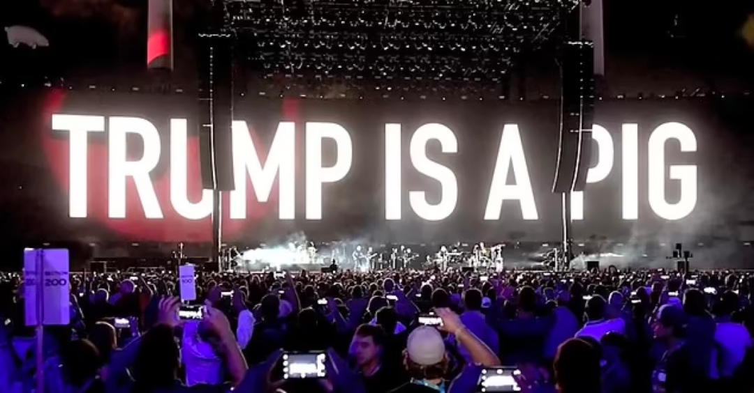 接着,主持人聊到了水爷在巡演中,用到的美国总统;在上一轮的巡演中,水爷挂了一幅巨大的照片,照片中说特朗普是一头猪;而在最新的这轮巡演里,水爷又将一张“拜登是战争犯”的照片用大屏幕放在舞台上。