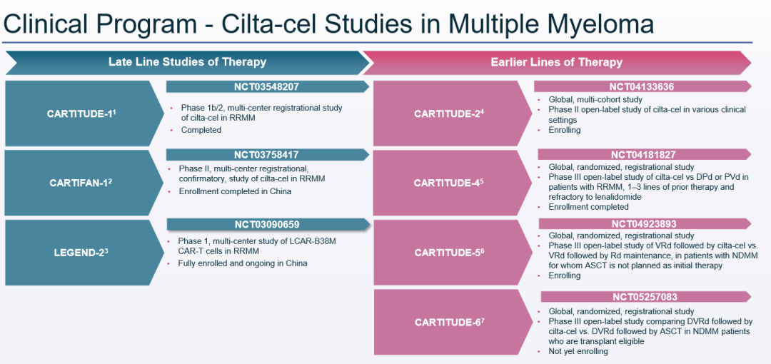 其中,传奇生物与杨森公司合作开发的BCMA CAR-T疗法cilta-cel(西达基奥仑赛)已在美国、日本、欧盟等地获批上市,用于治疗多发性骨髓瘤。2022年12月,该药在中国的新药上市申请也获得受理。在本届JPM大会上,传奇生物全面分享了cilta-cel的全球临床开发计划,包括分别针对多发性骨髓瘤末线治疗和前线治疗的一系列临床项目,并重点介绍了代号为CARTITUDE-1、CARTITUDE-2和CARTIFAN-1的3项研究成果。