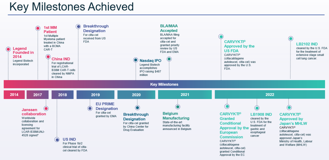 根据报告,传奇生物自2014年成立以来已实现多个关键里程碑,包括2017年与杨森公司(Janssen)达成合作、2020年在美国纳斯达克上市、2022年迎来首款获批疗法等。截止目前,传奇生物已在CAR-T(包括通用型CAR-T)、CAR-NK和CAR-γδT这3大领域建立核心技术平台,并拥有10个管线项目,覆盖恶性血液瘤和实体瘤。