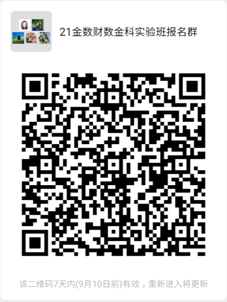 有意报名的同学请扫码进入微信群“2021金数财数金科实验班报名群”(仅限学生加入)。群内请使用实名(学院+姓名+学号),有问题可进一步咨询。按照指令填写报名表,进行线上报名。即日起开始报名,报名截止时间为2021年9月9日(周四)晚24:00。