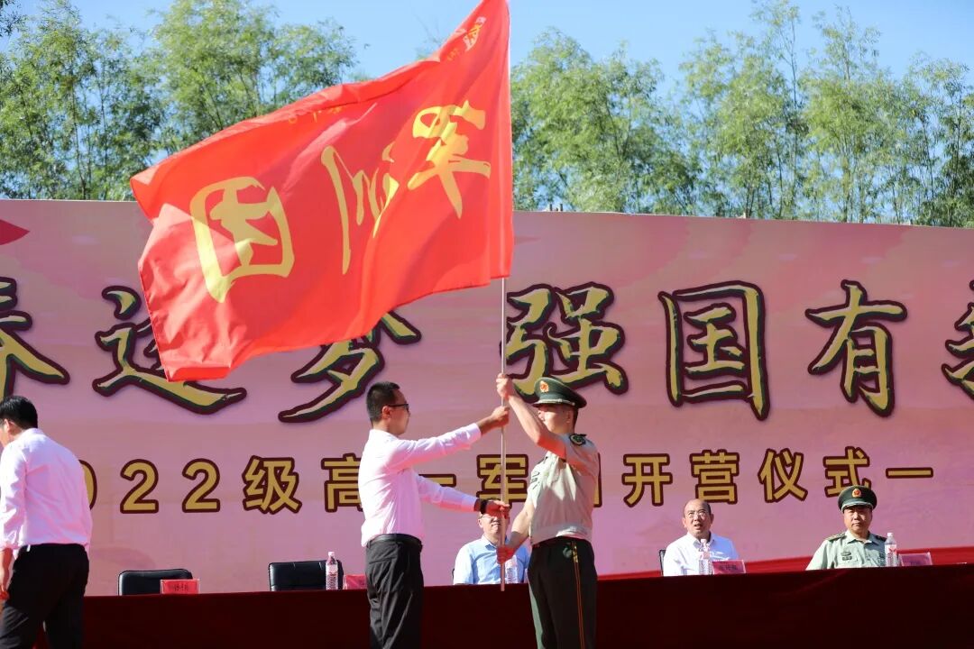 开营仪式第一项升国旗,在场校领导、老师和学生肃穆站立,行注目礼;教官行军礼。鲜艳的五星红旗伴随着激昂的国歌,在同学们坚毅目光的注视下徐徐上升,舞动的旗帜正如同学们的青春活力,彰显着奋发图强的刚毅与坚卓。