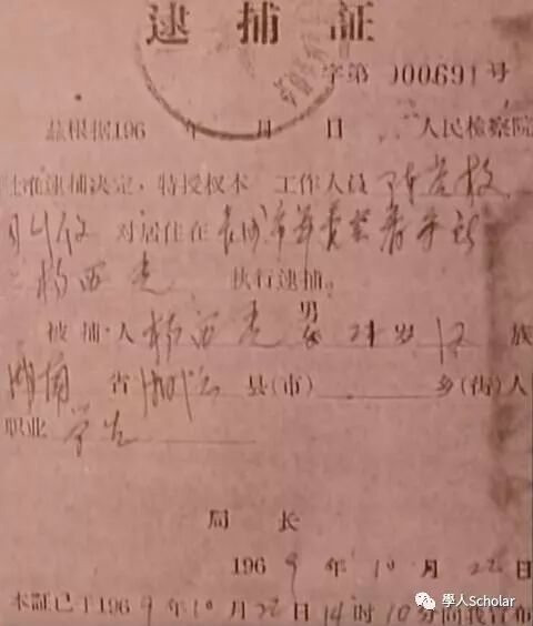文革期间杨小凯(时名为杨曦光)的逮捕证
