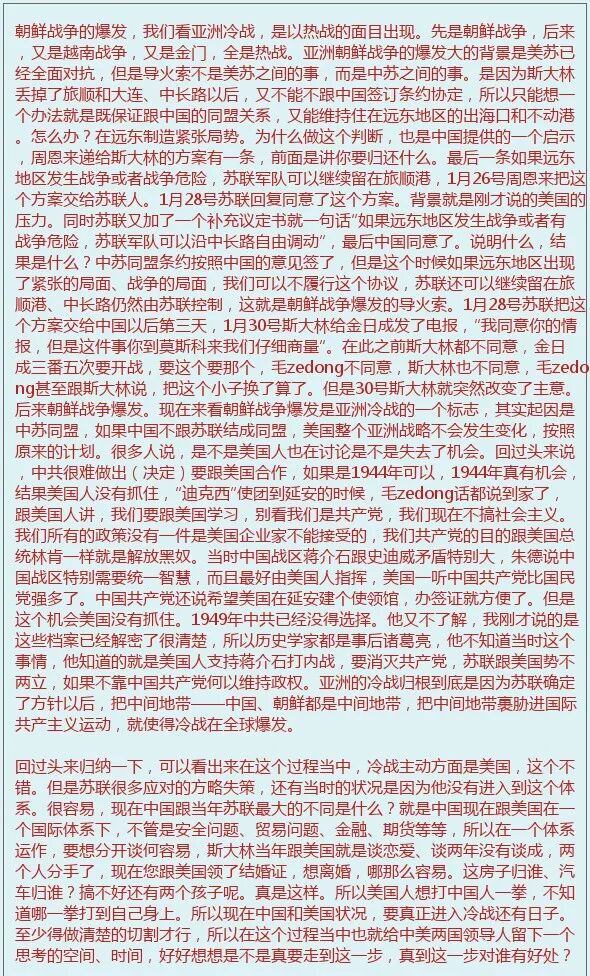 后来又一个比较重要的文件,凯南的电报,这个对美国政界影响非常大。凯南原来是一个大学教授,一直搞苏联问题研究,很有权威性,当时他在外交部门只是一个参赞,在苏联大使馆。丘吉尔铁幕演说以后,美国国务院要求评估一下到底现在苏联是什么状态?是不是要进攻美国?要做评估,正好大使史密斯不在,就交给凯南,凯南发回一封8000字的电报,那是一篇论文呀。他写的什么呢?苏联的行为及其根源,首先定义苏联是一个扩张型的国家,为什么?从历史上看俄罗斯怎么从一个大公国一点点扩大,欧亚大陆,所以这个民族传统就是扩张。第二苏联共产党意识形态就是扩张,因为他要搞世界革命,要搞共产主义,当然要扩张,把全世界资本主义都消灭,所以苏维埃的俄国一定是扩张的。把苏联的行为确定为扩张,苏联行为的根源就是传统和意识形态上的扩张主义,所以美国怎么办?遏制。必须得遏制他,不能让他随随便便想去哪里就去哪里,遏制战略就是这么出来的。其实这个是没有道理的。当时影响非常大,国务院如获至宝,印发给各个部门,大家一看这分析多透彻,其实很不是这么回事。为什么?就是凯南说的这两条都不是现实存在,而是从意识、理论上(来讲)。第一,扩张,苏联那时已经不需要扩张了,需要的东西都得到了。原来彼得大帝设想三个出海口他至少拿到两个,土耳其海峡至少也有通航权,波罗的海没有问题,加上太平洋,苏联周围都是他的势力范围还扩张什么呀?一扩张势必跟西方产生冲突,所以没有扩张的需要。第二苏联的观念也发生变化,你说他是共产主义,那会早就放弃了,解散共产国际就说明斯大林放弃了世界革命的主张、方针。所以本来凯南这个电报没有多大道理,但是正好迎合了美国右翼势力的思路,就广为传播。这样美国的反对声音更大。回过头来看当然这是斯大林讲话引起的,本来斯大林不是说给美国人听的,他是说给苏联人听的,美国人听了很不舒服。英国人又折腾,一步步造成了美国国内的对“苏联威胁论”的定位。这是很重要的部分。