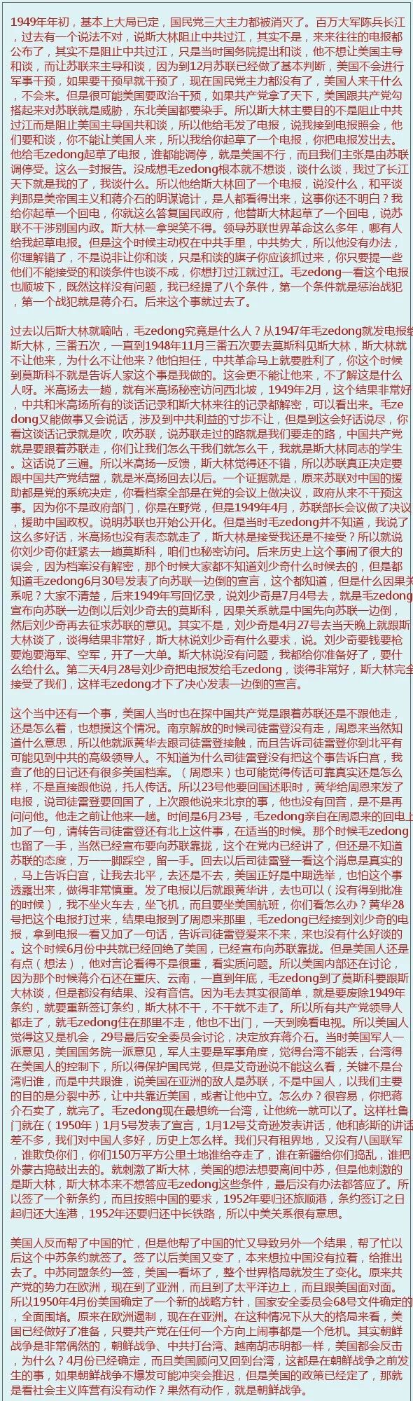 沈志华:这个有道理,这个准备比较早,大概2月份开始准备,那个时候中苏条约还没有签,是针对苏联十九大举办成功,但是跟着我看行文把三件事连在一起,紧接着10月份中华人民共和国成立,跟着2月份中苏签同盟条约,苏联势力范围的这一跨步,跟欧洲,东欧、波兰绝对不一样,一下子就跨到了太平洋沿岸,而且中国这么大的体量跟苏联拢在一起。目标当然不是中国,还是苏联,但是一直到1962年之前,美国的思维定式就没有变过,他认为中国和东欧一样也是苏联的卫星国,所以他是针对苏联的,没错。但是他把你算作苏联的势力范围,就像他对东欧国家的态度是一样的。