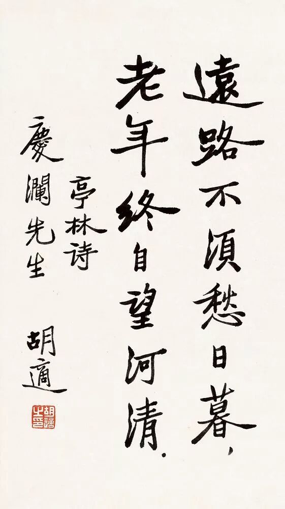 学人按:顾炎武的"远路不须愁日暮,老年终自望河清"(《五十初度时在昌平》)是胡适晚年最喜欢的诗句,曾多次题赠给友人。胡适曾在一次演讲说,我们要走的路是"长期"的"远路",是"绵绵无绝期"的远路,走远路不怕晚,"不须愁日暮"。今天黑了,明天起早行。我们老了,还有无数青年人在。一代完了,还有一代继起。