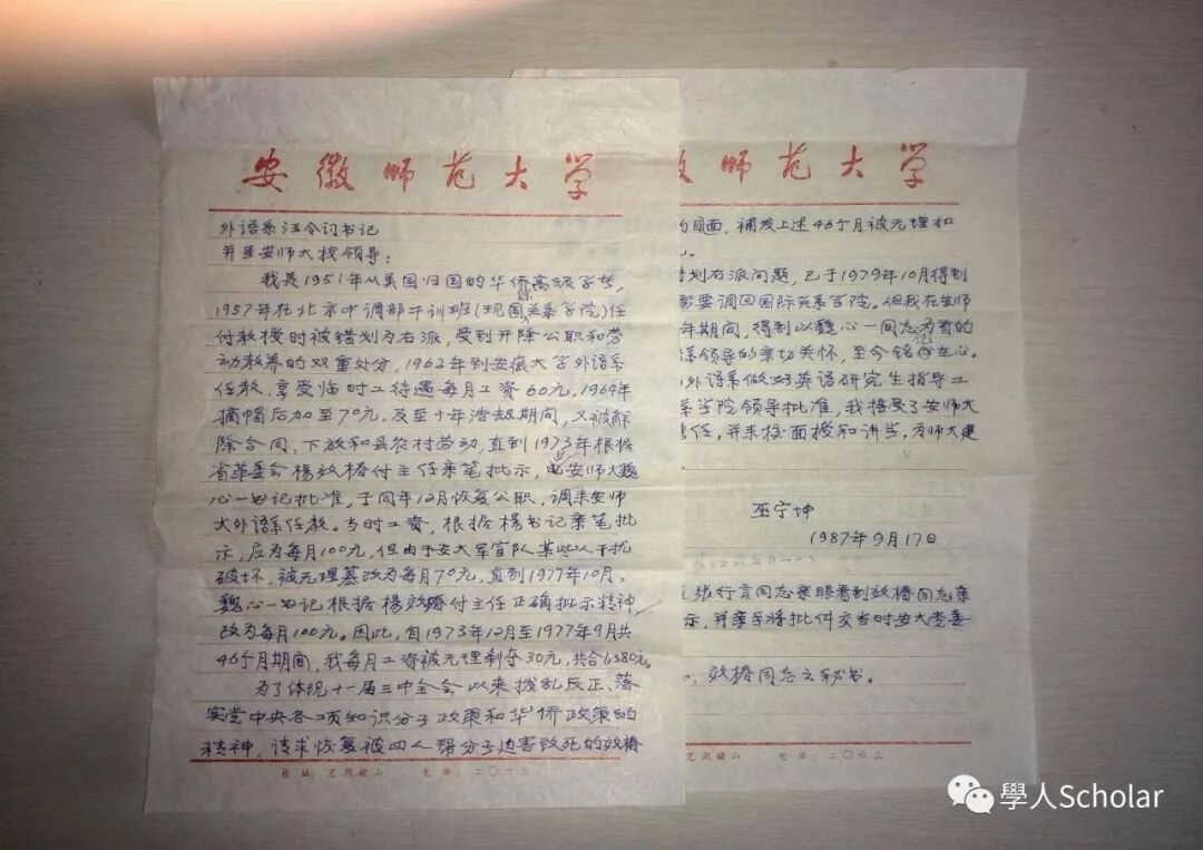 学人按:巫宁坤先生于1974年调入芜湖安徽师范大学工作,1979年调回北京原单位国际关系学院。按多封信札字迹比照推测,此信可能不是巫宁坤先生亲笔,或由亲属代笔?