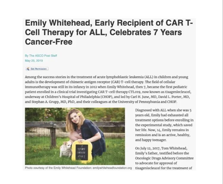 那么去年新闻上大家可能知道这个小女孩就是Emily Whitehead,她去年大概14岁吧,她7岁的时候就得了这个白血病,当时就是已经变成refractory,没有办法了,那么她就用了CAR-T CELL THERAPY。到了去年的时候,报纸上讲,她已经没有癌细胞了,一个非常漂亮可爱的小女孩儿,被治好了,所以这个是非常非常的振奋人心。大家有机会可以网上看她的这个故事,很感人。