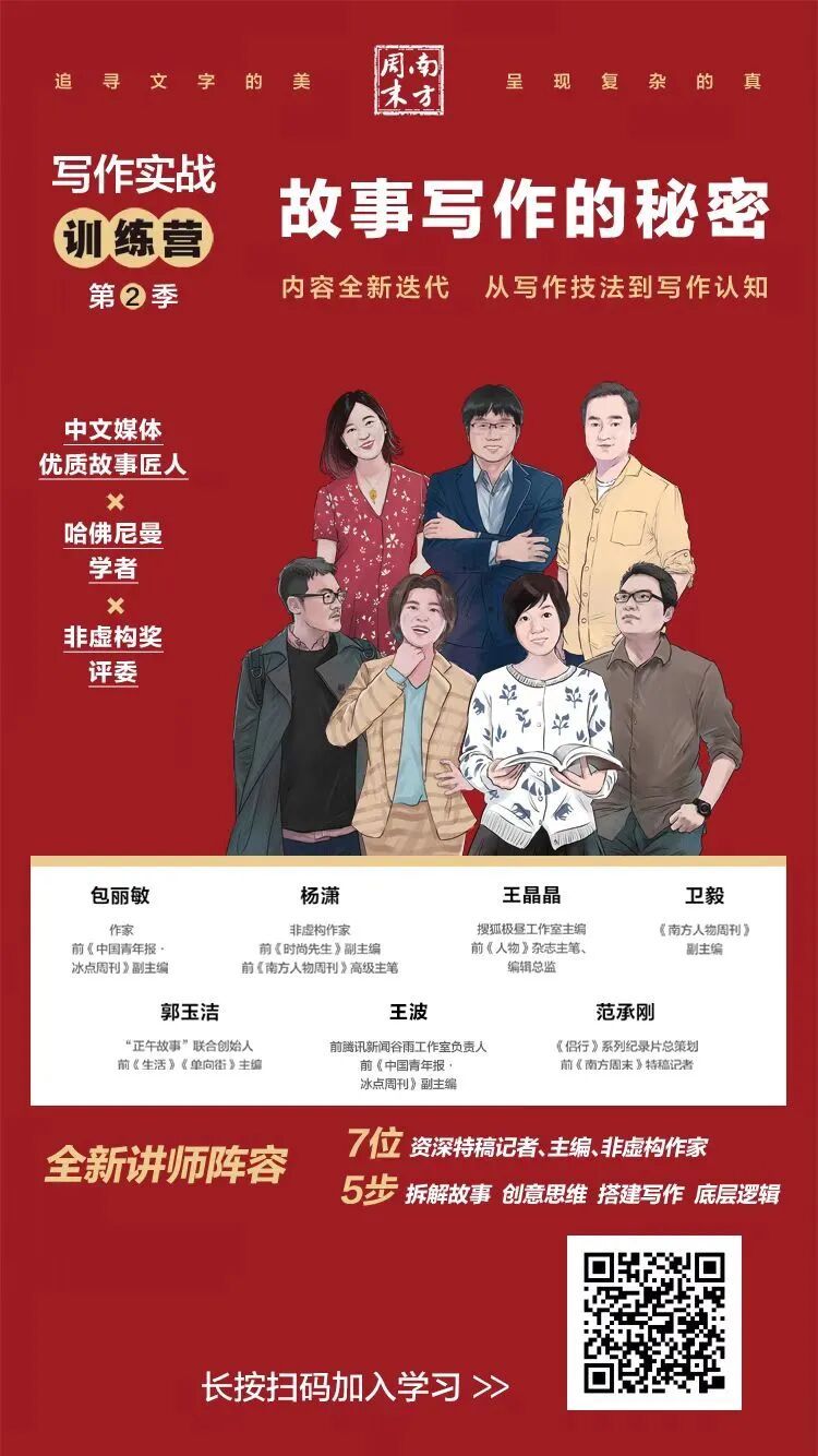 去年,我们扩大邀请范围,遍寻中文互联网优质媒体,网罗7位非虚构写作行业的故事匠人,共同推出进阶课程《南方周末写作实战训练营第二季:故事写作的秘密》。