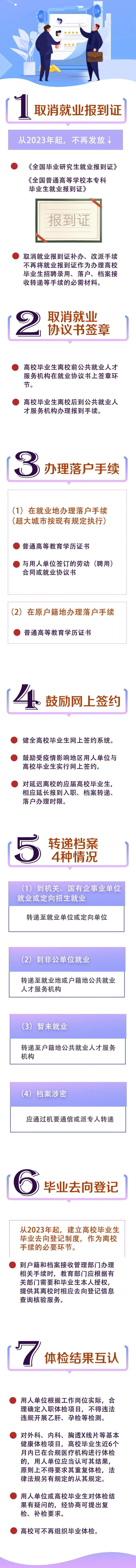 从2023年起,不再发放《全国普通高等学校本专科毕业生就业报到证》和《全国毕业研究生就业报到证》(以下统称就业报到证),取消就业报到证补办、改派手续,不再将就业报到证作为办理高校毕业生招聘录用、落户、档案接收转递等手续的必需材料。
