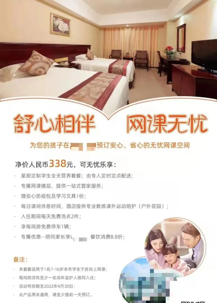 部分推出“网课房”的酒店大多在宣传广告中标明了“每间房须至少有1名成年监护人陪同入住”,还有部分酒店推出的“网课房”则未说明需成年人陪同。此外,大多数“网课房”宣传适用于“7—16岁学生”,有的酒店宣传单上显示招收学生低至3岁。