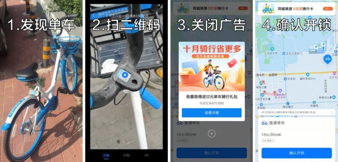 那三种车哪种扫码最快捷呢?经过多次测试,我发现三种车扫码开锁的底层逻辑基本一致,就是4步走: