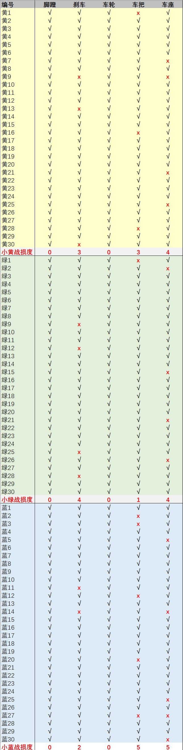 1、从战损程度看,小蓝>小黄>小绿,小蓝要加紧维修啊 2、车座是最容易破损的,其次是车把和刹车。大家一定要注意检查。但脚蹬和车轮相对比较抗造。 3、从车把来说,小绿车最不易损伤,可能是坚强。 4、从刹车来说,小绿的手刹最容易损伤,可能是不坚强。 ……