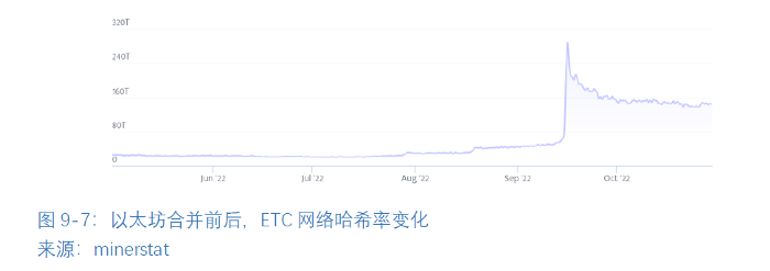 在以太坊合并之前,矿工有三条出路:(1)卖掉GPU矿机;(2)转为其它公链网络的矿工;(3)支持以太坊硬分叉。若矿工选择转为其它网络,在熊市的风险无法估计且收益小,所以大部分矿工选择了卖掉GPU矿机,导致显卡价格从2021年12月以来下降约50%。剩下的小部分矿工去了ETC,ETC币价在7月有大幅上涨,但与以太坊相比,ETC对矿工的收入仍然有限,所以其上涨主要还是由于投机原因。以太坊顺利合并后,ETC的算力增加了5倍,目前维持在141.4571 TH/S,DASH在9月的算力有短时升高。