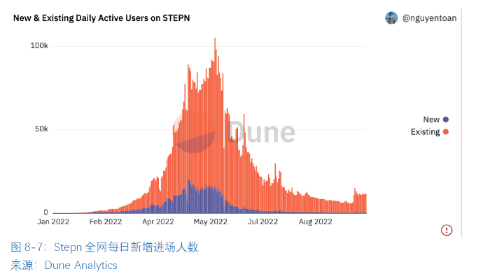 今年上半年,Stepn开创性的为区块链引入了Move to Earn的经济模型,并获得了巨大的成功。大量的Web2从业者开始意识到Play 2 Earn并不仅仅局限于各种游戏,将传统Web2行业场景添加代币经济依然会大受欢迎,X to Earn的模式也正是在这个契机下诞生的,一时间无论是运动、学习、唱歌甚至睡眠这些场景都开始采用X To Earn模式,试图将代币激励模式从线上场景转移至更有现实意义的线下场景中。然而展望过去一年X To Earn的发展,数据并不如人意,例如Stepn在5月最高日进场人数达到10万人,而目前已经不足1万人,进场人数减少后进入的用户与投资者应该已经无法再计算回本周期。