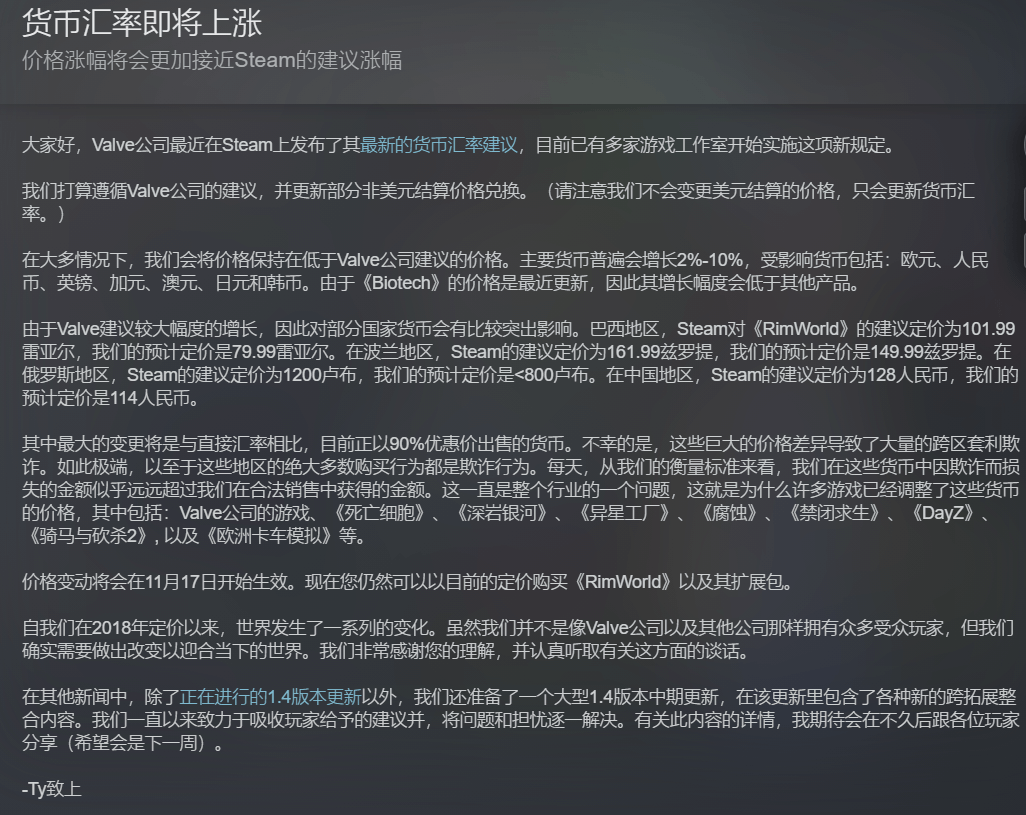《环世界》官方发布公告称,他们决定尊重V社的最新货币汇率建议,更新部分非美元结算价格,国区价格从103元涨到114元。该变动将会在11月17日开始生效。