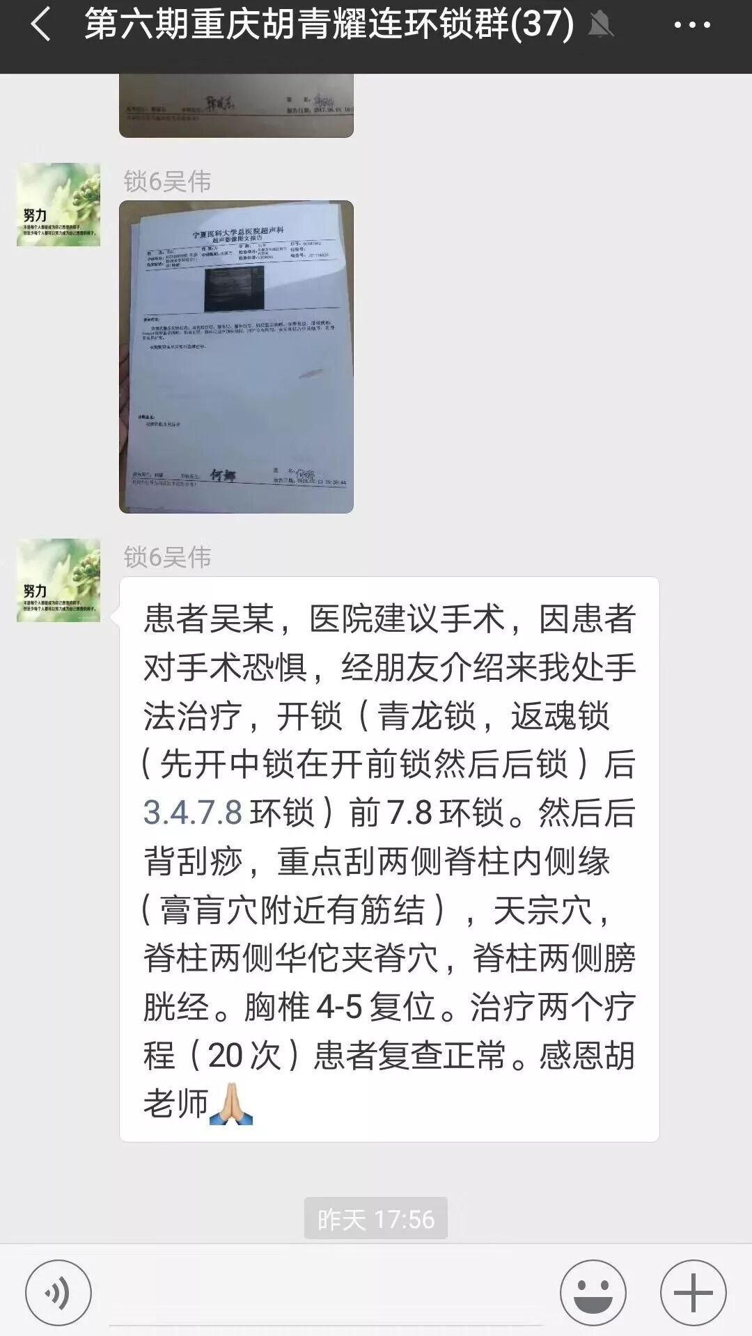 患者因为害怕手术,学员对其刮痧、开锁(青龙锁、返魂锁),胸椎复位,通过开锁20次,患者复查正常;治疗球员,其腿缝并拢,见效快。