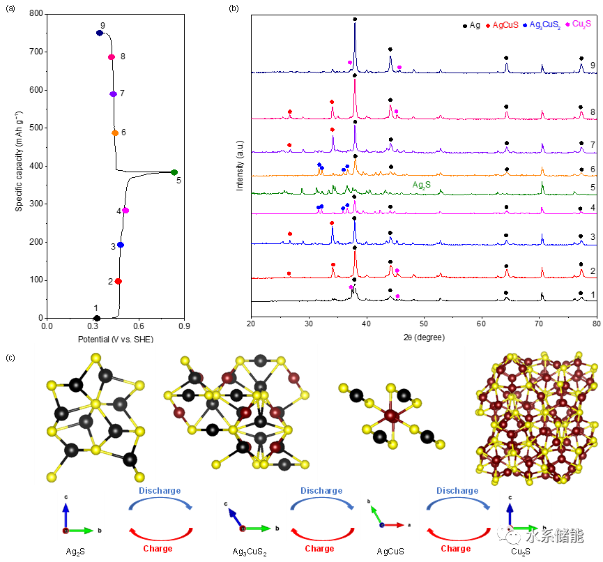 (a) Cu-Ag2S电池的充放电曲线。(b)充放电过程中的非原位XRD。(c)Ag2S, Ag3CuS2, AgCuS和Cu2S的结构示意图。