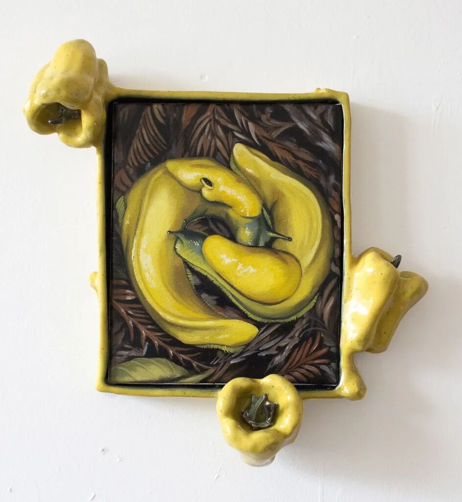 Stephanie Temma Hier 的俏皮作品赞颂鱼类、蔬菜、谷物、鲜花和水果,并试图提醒观众,我们所有消费的东西都源于自然和地球本身。她制作了异想天开的陶瓷画框,将她的海鲜、柠檬、南瓜、青菜等画作转化为奇幻、幽默的雕塑。在一幅作品中,原为花椰菜的画作在西兰花画框的包围下,显得非常陌生;而在另一幅作品中,陶瓷煎蛋与画中的雏菊地形成呼应,创造出一种混乱的感官体验。这些作品最近在上海的 Gallery Vacancy 和多伦多的 Franz Kaka 画廊举办了个展,并参加了在纽约阿森纳当代艺术馆(Arsenal Contemporary)举办的群展。
