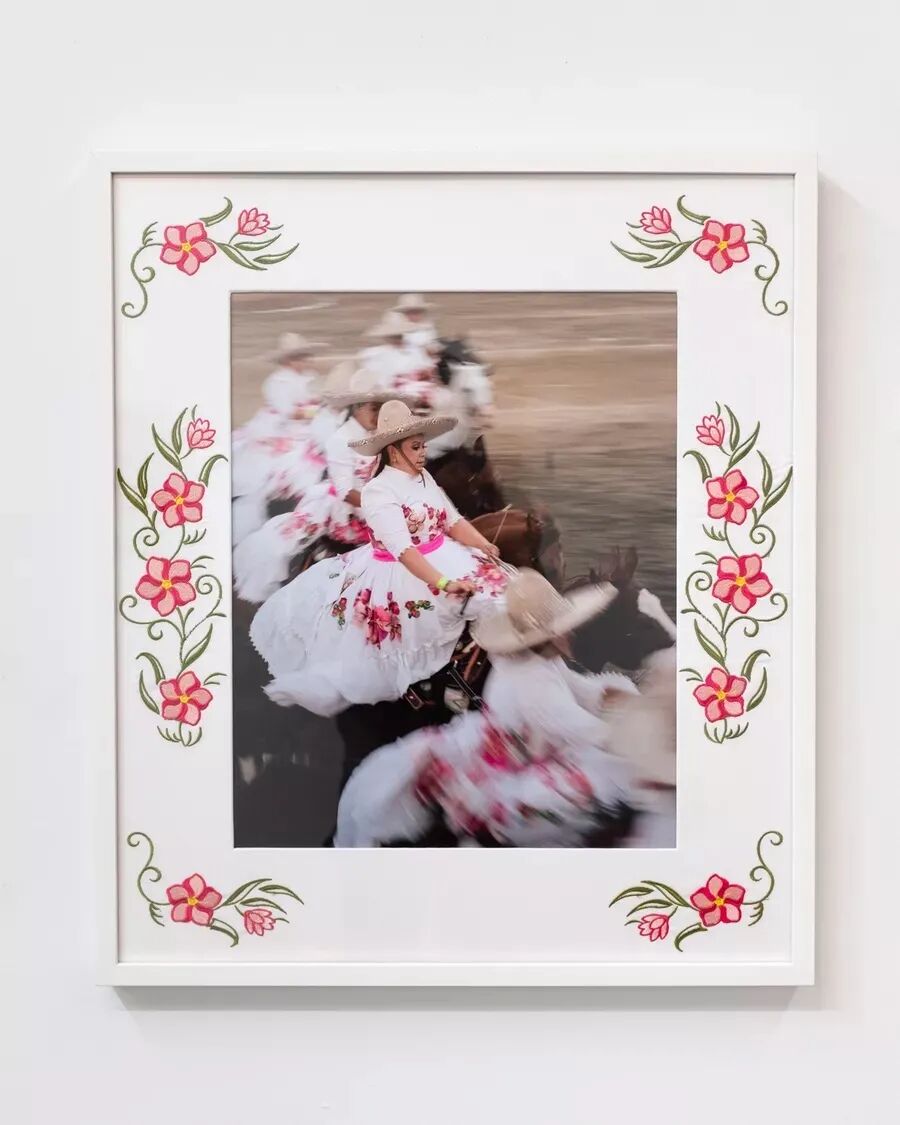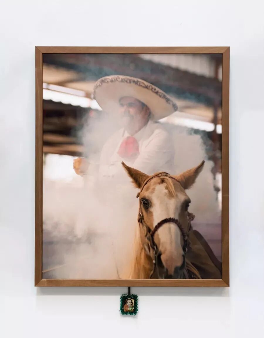 在他目前的个展 “Tierra del Sol”(意为太阳之地)中,贾拉米洛把纽约的 Selenas Mountain 画廊转变成了一个牛仔竞技场。画廊的墙上挂着贾拉米洛拍摄的加州皮科里维拉(Pico Rivera)年度赛马会(charrería) “El Clásico de las Américas”的照片。赛马会是墨西哥的一项牛仔竞技传统,展示了旧墨西哥庄园曾一度盛行的马术、表演、服装和运动精神。通过对表演者身体强烈且碎片化的特写,贾拉米洛撇去了运动的观赏性,以人文的视角关注其背后经常被忽视的劳动。