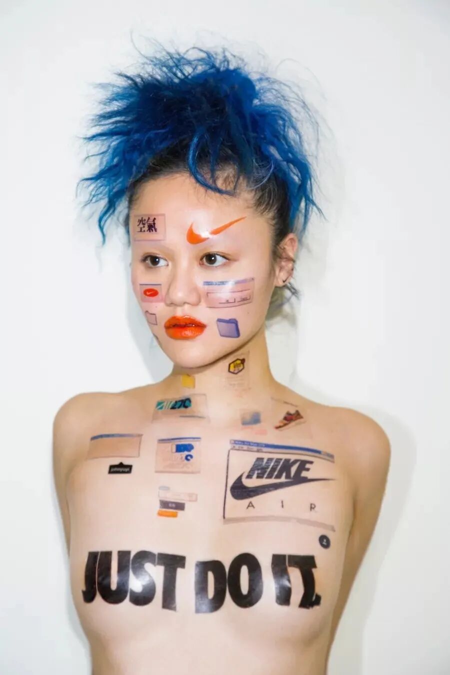 6月10日,苏黎世的 Christophe Guye 画廊将举办江宥仪的同名个展。在展出的作品之一《Wear NIKE 7》(2018)中,一位女性在她裸露的胸前印上了标志性的“Just Do It”标语。耐克的标志以及2000年代的电脑图标和弹出式浏览器也出现在了她的脸和脖子上,对后互联网时代通过品牌亲和力完成的身份构建进行了生动的演绎。