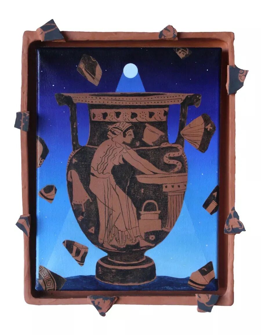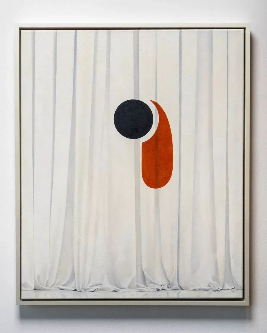 在《Cassandra》(2022)中,陶土做的框架围绕着一幅描摹古希腊红彩陶双耳喷口杯的画作;而在《Mundus Inversus》(2022)中,枫木做的框架则勾勒出透过一对血红色窗帘所窥视到的明月。从欧弗洛尼奥斯(Euphronios)、乔治亚·欧姬芙(Georgia O'Keefe)再到乔纳斯·伍德(Jonas Wood),这些画作唤起了跨越各个时代的艺术史传统,但也同时拒绝被任何一个时代所束缚。