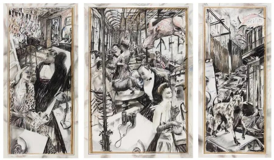 在本次回顾展最早期的作品中,《The Conservationists’ Ball》(1985)是一幅炭笔三联画,描绘了一个华丽、纵情的咖啡馆内部,有些许欧洲的味道;纵观肯特里奇生涯成熟期的作品,他11分钟的电影《Notes Towards a Model Opera》(2015)则呈现了肯特里奇的素描与各类现成的中非关系录像之间的巧妙联结。