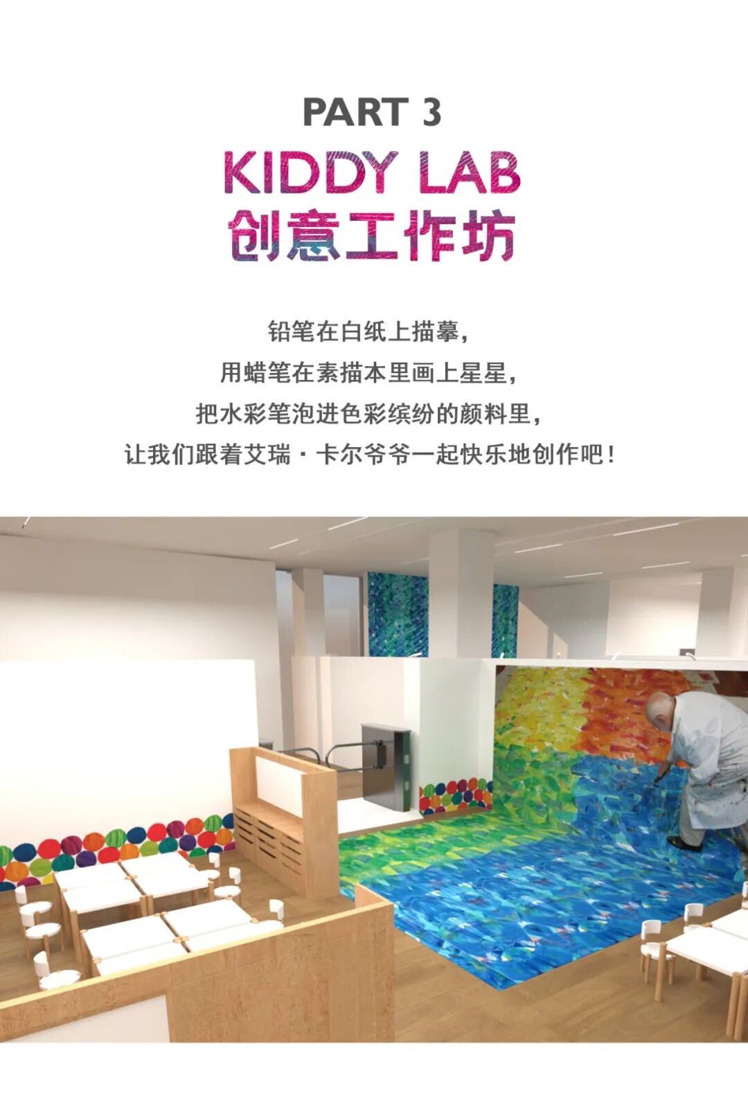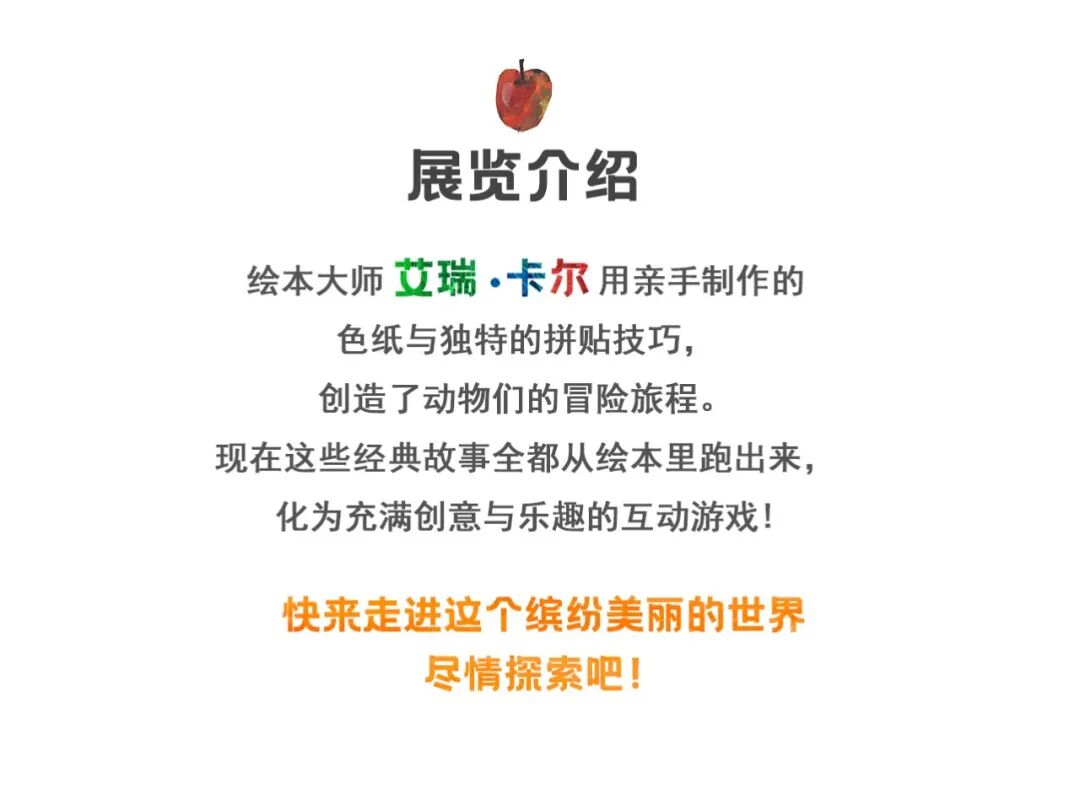 作为展览主办方,碰碰儿童艺术博物馆首次引进美国艾瑞·卡尔图画书美术馆与匹茨堡儿童博物馆合作开发的儿童互动展览:运用多种媒介将绘本故事场景化、游戏化;还原艾瑞·卡尔充满童心与想象力的艺术王国,鼓励亲子互动,营造寓教于乐、沉浸式的观展体验。展览希望以“启发”(inspire)作为原点,让孩子们在游戏和探索中认识这个美好的世界。