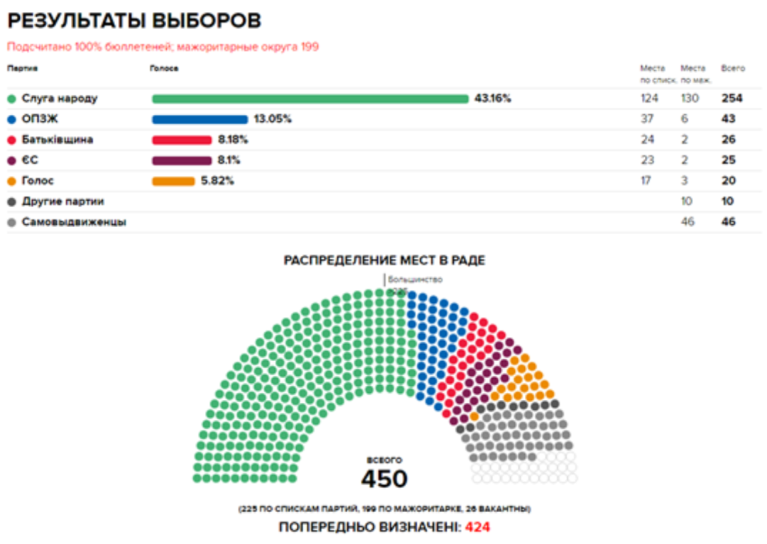 ◇ 2019年7月26日,乌克兰新总统泽连斯基所在的人民公仆党得票率最高,为43.16%,“反对派平台—为了生活”党(13.5%)、祖国联盟党(8.18%)、欧洲团结党(8.1%)、声音党(5.82%)分列2至5位。而在199个单席位选区中,人民公仆党赢下了占据绝对多数的130个席位。