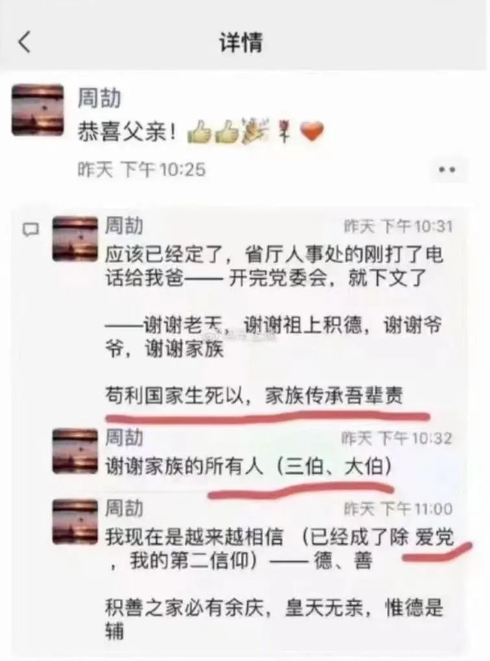 这位几年来一直孜孜不倦地发朋友圈,二十万的茶叶,十套房子,副省长给自己递烟,这都不算啥,最关键的是周公子有自己的一套哲学,觉得这非常理直气壮。还有很多语录,什么“王侯将相,就是种乎”,什么“儿子帮老子,严嵩严世蕃”,什么“苟利国家生死以,家族传承吾辈责”。