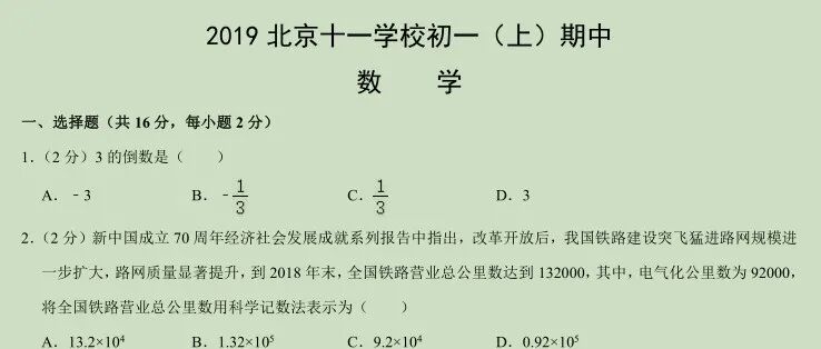 北京十一学校2019-2020学年初一(上)期中数学试卷及答案