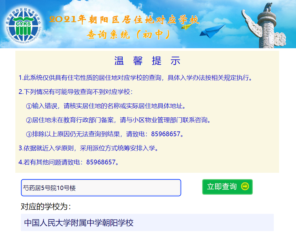 1.此系统仅供具有住宅性质的居住地对应学校的查询,具体入学办法按相关规定执行。