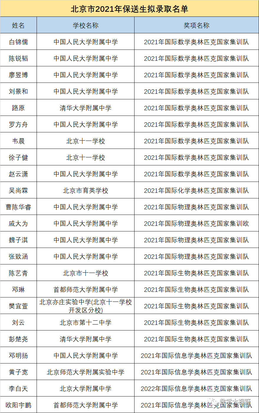 2021年,北京共有23人进入国家集训队获得保送生资格,其中18人为高三考生,5人为高一高二学生。最终18人被清北录取,其余5人将在高三后再被录取。