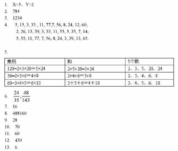 5、找出5个互不相同的大于1的自然数,使得其中两个数的积等于其余三个数的积,两个数的和(不一定是刚才的两个数)等于其余三个数的和,请写出满足条件的式子。