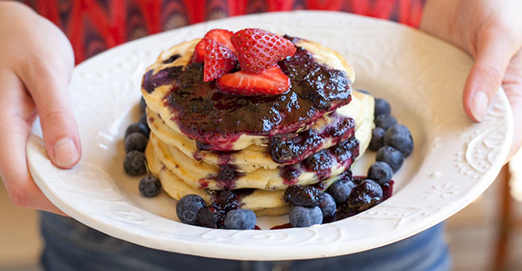 好的alt文本:煎饼 | 更好的alt文本:双手捧着一个白色的盘子,上面放着一叠覆盖着蓝莓和草莓的蓝莓煎饼。
