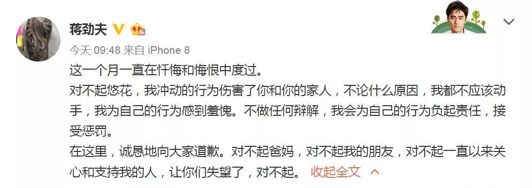 在这个过程中,蒋劲夫除了承认家暴外,始终都没有现身说过一句话。